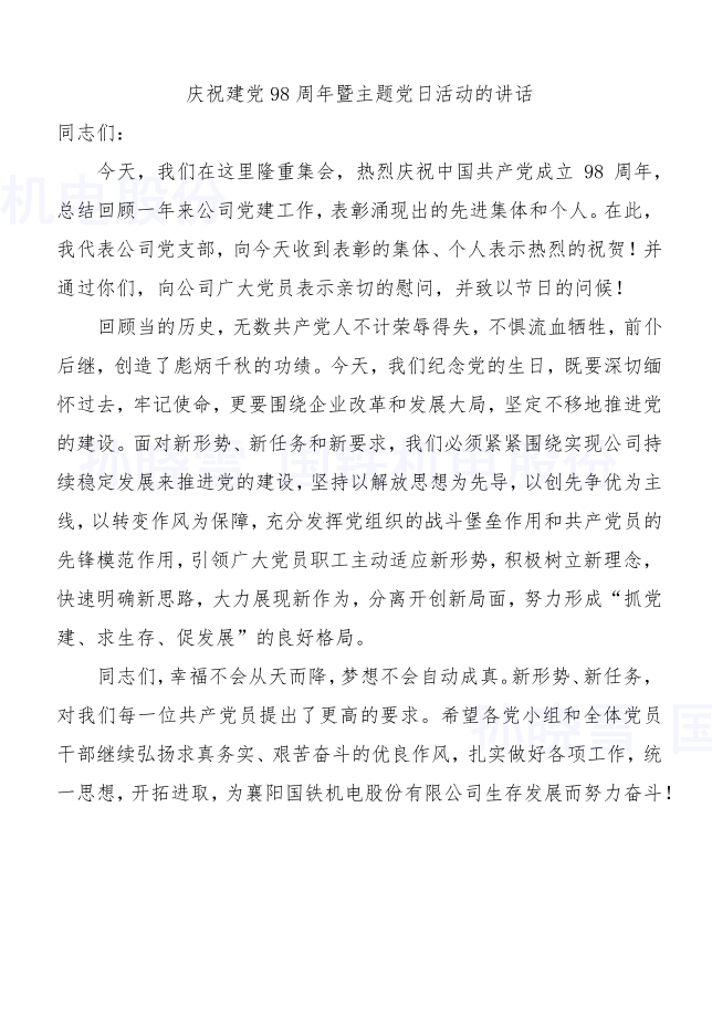 今年是建黨98周年?!捌咭弧鼻昂螅尻枃F機(jī)電股份有限公司開展了豐富多彩的紀(jì)念活動(dòng),以傳承紅色基因、弘揚(yáng)革命精神,不忘初心、牢記使命,矢志為中華民族偉大復(fù)興中國夢(mèng)努力奮斗。