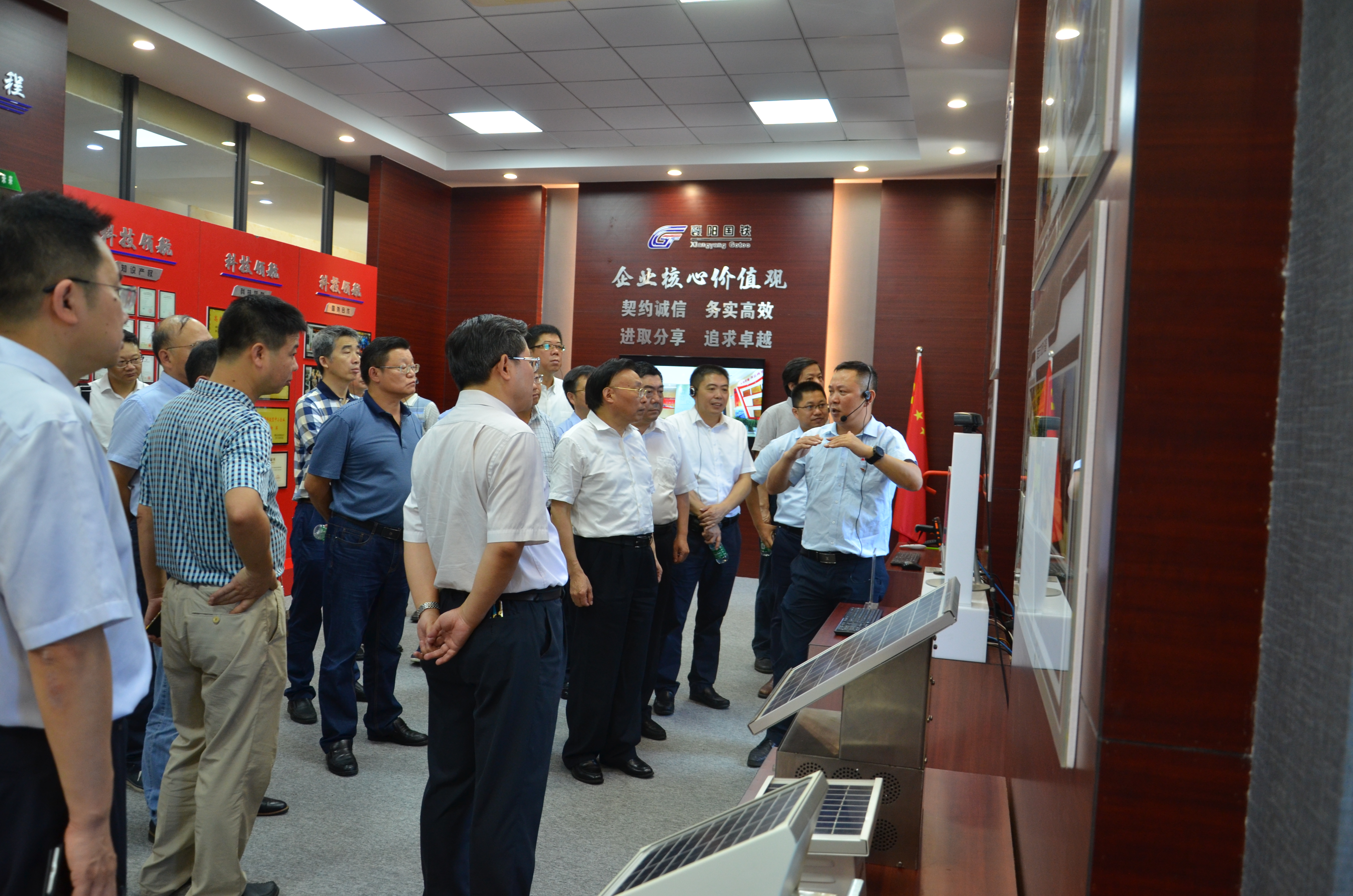 張清杰校長(zhǎng)、李德璋副市長(zhǎng)等一行首先參觀(guān)了公司展廳,曾建勇董事長(zhǎng)介紹了公司“產(chǎn)品創(chuàng)新”、“國(guó)際合作”、“企業(yè)文化”等方面的情況。張清杰校長(zhǎng)對(duì)我公司自主研發(fā)的“軌道交通信息化管理系統(tǒng)”給予了高度的贊賞,李德璋副市長(zhǎng)稱(chēng)贊襄陽(yáng)國(guó)鐵是一家勇于創(chuàng)新的優(yōu)秀企業(yè),鼓勵(lì)公司繼續(xù)加強(qiáng)技術(shù)儲(chǔ)備,帶動(dòng)全市軌道交通產(chǎn)業(yè)的發(fā)展。