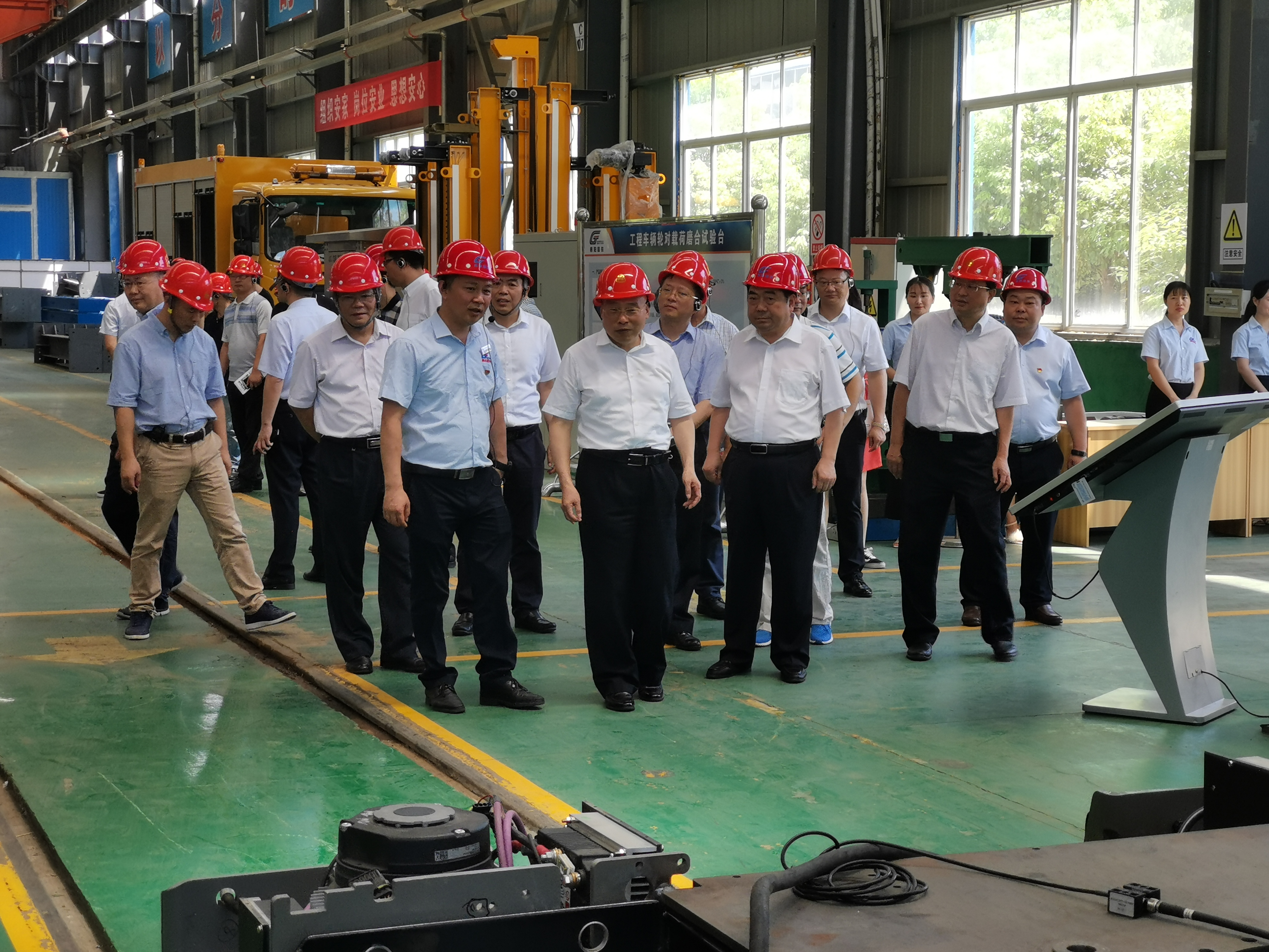 張清杰校長(zhǎng)、李德璋副市長(zhǎng)等一行走出展廳步入生產(chǎn)車(chē)間,邊走邊看,不時(shí)詢(xún)問(wèn)生產(chǎn)操作人員和技術(shù)人員,在新產(chǎn)品研發(fā)車(chē)間參觀(guān)了“輪對(duì)、受電弓在線(xiàn)激光檢測(cè)系統(tǒng)”、“公鐵兩用車(chē)”等創(chuàng)新產(chǎn)品。
