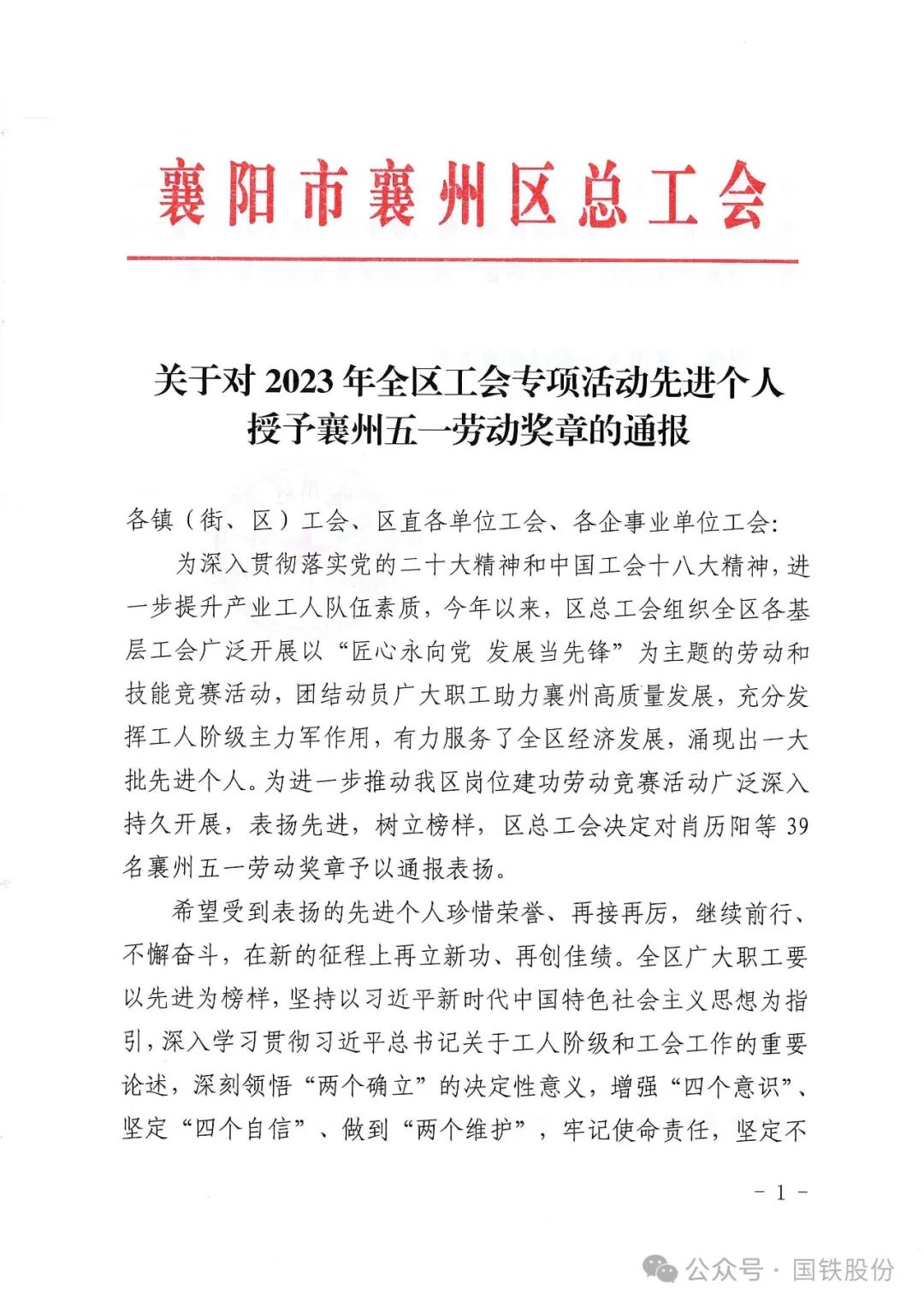 【喜報(bào)】恭賀楊定全同志獲“襄州五一勞動(dòng)獎(jiǎng)?wù)隆睒s譽(yù)