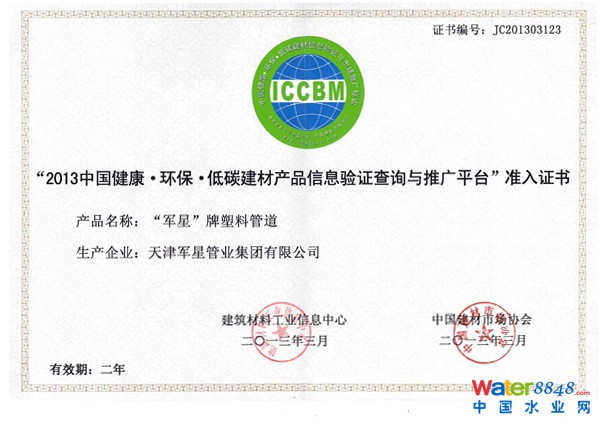 日前,經(jīng)中國(guó)建材市場(chǎng)協(xié)會(huì)、建筑材料工業(yè)信息中心專家組嚴(yán)格審核,我軍星管業(yè)集團(tuán)順利通過審核,獲得 “2013中國(guó)健康•環(huán)保•低碳建材產(chǎn)品信息驗(yàn)證查詢與推廣平臺(tái)”準(zhǔn)入證書和“2013中國(guó)健康•環(huán)保•低碳塑料管道采購(gòu)首選供貨單位”推廣證書。