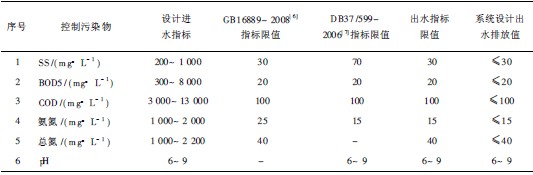 系統(tǒng)設(shè)計日處理量80m3. 設(shè)計進(jìn)水指標(biāo)及出水排放指標(biāo)見表1 所示. COD、BOD、SS、氨氮、總氮及pH 等為污染排放主要控制指標(biāo), 第四列及第五列分別為以上各指標(biāo)在GB16889- 2008及DB37 /599-2006中的排放限制, 第六列為兩標(biāo)準(zhǔn)的較嚴(yán)格值, 為保證出水達(dá)標(biāo), 本設(shè)計各污染物排放值(第七列)應(yīng)低于相應(yīng)第六列限值.