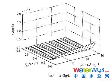 利用式(6) ,可以對不同運行條件下的膜過濾阻力的變化,即膜污染的發(fā)展速率進行預(yù)測. 圖4 所示為使用數(shù)學(xué)軟件Matlab (611) 分別在X = 2 和20g/ L 下作出的K 關(guān)于J 與uLr的關(guān)系曲面圖.