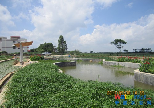 3、設(shè)計思路及工藝特點:根據(jù)當?shù)匚鬯欧湃ハ蛱攸c及自然條件,采用無動力“復合式人工濕地+生態(tài)渠”工藝,在實現(xiàn)環(huán)境整治與生態(tài)效應的同時,融入景觀設(shè)計理念,把村中的污水塘改造為具有污水處理及景觀功能的村中生態(tài)濕地公園。經(jīng)過處理后系統(tǒng)出水水質(zhì)達到《城鎮(zhèn)污水處理廠污染物排放標準》(GB18918-2002)中一級B標準中指標要求,水體感觀清澈透明;通過工程實施使原有的臟、臭水塘變成一個清新自然的村中生態(tài)濕地公園,為村民提供一個優(yōu)美的休憩場所,形成和諧的新農(nóng)村面貌,達到城鄉(xiāng)風貌改造預期效果。
