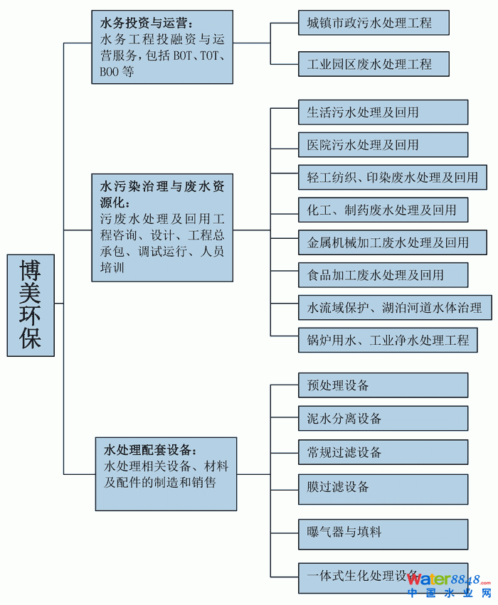 博美環(huán)保集水污染治理及廢水資源化咨詢、投資、設(shè)計、制造、建設(shè)及運(yùn)營于一體,已成為國內(nèi)廢水環(huán)境治理領(lǐng)域經(jīng)驗豐富、能為客戶提供全面解決方案的環(huán)保服務(wù)專家,其經(jīng)營領(lǐng)域包括: