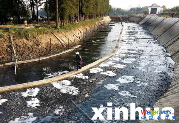 據(jù)工作人員介紹,秀湖明渠里插著成排的曝氣器,渠底淤泥被曝氣管吹起,從而導(dǎo)致臭味更大(10月25日攝)。新華社記者 肖藝九 攝