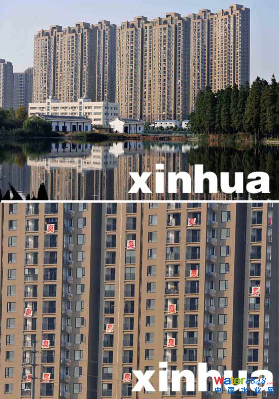 居民在陽(yáng)臺(tái)上掛著“臭”字表示抗議(10月25日攝)。新華社記者 肖藝九 攝