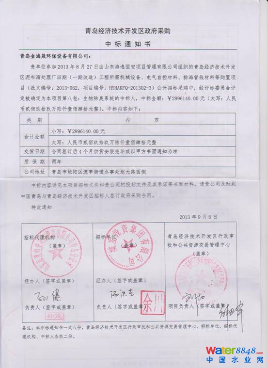 來自國內(nèi)的上海實力機(jī)電、常州天興環(huán)保、江蘇純江環(huán)保和青島金海晟等公司共同參與了該項目的投標(biāo)活動。經(jīng)過專家小組的統(tǒng)一論證,我公司以優(yōu)良的設(shè)備、突出的特性、合理的價格、誠懇的服務(wù),得到專家小組的一致好評。專家小組推薦我公司為第一候選人,并報經(jīng)市政府采購中心批準(zhǔn),確定青島金海晟環(huán)保公司為中標(biāo)人。