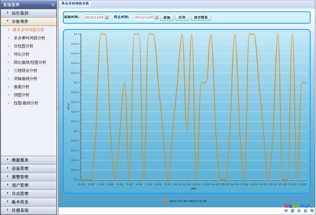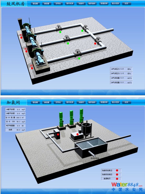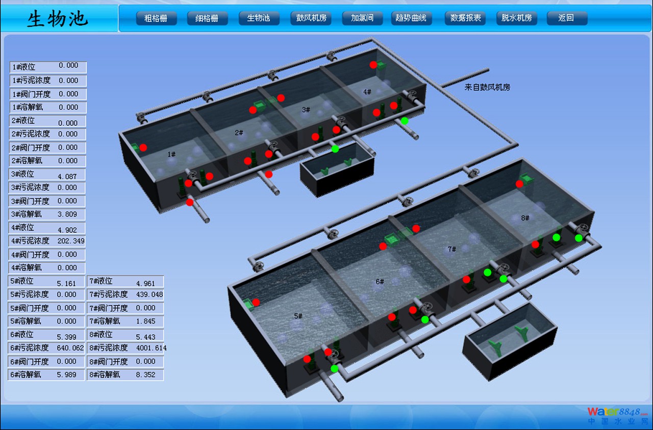 系統(tǒng)以美觀、友好的界面顯示設(shè)備運(yùn)行狀態(tài)、流量、水位、COD超聲波液位計(jì)、溶解氧計(jì)、氧化還原電位計(jì)、污泥濃度計(jì)、電磁流量計(jì)、等數(shù)據(jù),并以仿真圖、直方圖和曲線圖、棒圖等多種方式清晰直觀的顯示各個(gè)敏感數(shù)據(jù),方便用戶(hù)對(duì)各敏感數(shù)據(jù)進(jìn)行歷史查詢(xún)和對(duì)比分析。
