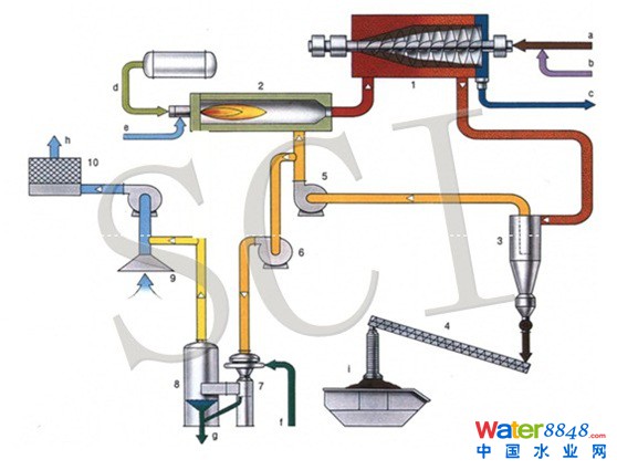 污泥(或物料)[a]經(jīng)進(jìn)料系統(tǒng)被輸送到Centridry專用臥螺離心機(jī)[1]前,并與絮凝劑投配系統(tǒng)調(diào)配好的絮凝劑[b]完成絮凝作用后,一同進(jìn)入專用臥螺離心機(jī)[1]內(nèi)完成固液分離,固相經(jīng)螺旋輸送器輸送至離心機(jī)出渣口,并通過(guò)特殊設(shè)計(jì)的結(jié)構(gòu)分散成松散的固體顆粒。固體顆粒在專用臥螺離心機(jī)[1]的獨(dú)有反應(yīng)罩內(nèi)與熱空氣發(fā)生系統(tǒng)[2]提供的熱空氣快速地進(jìn)行熱量交換,在幾秒內(nèi)完成干燥作用,并由熱蒸汽帶出專用臥螺離心機(jī)[1],完成脫水和干燥。濾液[c]經(jīng)離心機(jī)收集罩收集后排至集水井或指定地點(diǎn)。干燥后的固體粉末和蒸汽(簡(jiǎn)稱“煙氣”)一同被輸送至旋風(fēng)分離器[3]內(nèi)完成固氣分離。固體粉末通過(guò)旋風(fēng)分離器[3]下的旋轉(zhuǎn)閥門排出,并通過(guò)下部的輸送系統(tǒng)[4]輸送至指定地點(diǎn)。干燥后仍具有一定熱值的熱蒸汽被回收利用,通過(guò)循環(huán)風(fēng)扇[5]被輸送至熱空氣發(fā)生系統(tǒng)[2]進(jìn)行再次加熱和“除臭”。多余的廢氣通過(guò)廢氣風(fēng)扇[6]被輸送至文丘里氣體凈化器(包括:文丘里除塵器[7]和冷凝器[8])完成氣體的凈化和冷凝,最后通過(guò)輔助風(fēng)扇及生物凈化裝置后排至大氣。