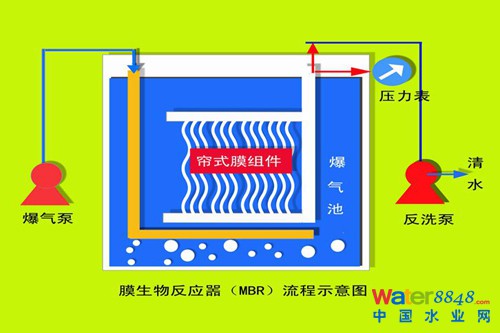 膜-生物反應(yīng)器(Membrane Bio-Reactor,簡稱MBR)是一種由膜分離技術(shù)與生物處理技術(shù)有機結(jié)合的新型態(tài)廢水處理系統(tǒng),取代傳統(tǒng)活性污泥系統(tǒng)中占地較大的二沉池,利用沉浸于好氧生物池內(nèi)之膜分離設(shè)備截留槽內(nèi)的活性污泥與大分子固體物,活性污泥(MLSS)濃度可達(dá)到10g/L以上,污泥齡(SRT)可延長30天以上,如此高濃度系統(tǒng)大大降低了生物反應(yīng)池體積和建工作業(yè)量,產(chǎn)水水質(zhì)可達(dá)到國標(biāo)GB8978-1996污水綜合排放的一級A標(biāo)準(zhǔn),成為21世紀(jì)污水處理與水資源回收再利用的最優(yōu)選擇。