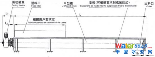該產(chǎn)品由驅(qū)動裝置、無軸螺旋、U型槽、襯板、蓋板、進出料口組成。物料落入進料口后,經(jīng)無軸螺旋推動至出料口。