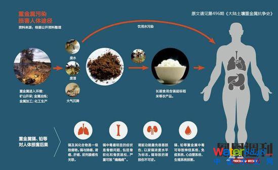 江西省樂平市洛口鎮(zhèn)戴村是污染的另一樣本。在鄰近村莊的樂安河上游,江西銅業(yè)集團(tuán)興建有多家礦山,包括中國最大的露天礦山——德興銅礦。根據(jù)樂平市政府的調(diào)查,自上世紀(jì)70年代開始,由于上游有色礦山企業(yè)的生產(chǎn),樂安河流域每年接納的“三廢”污水排放總量達(dá)6000多萬噸,廢水中包括鎘、鉛等重金屬在內(nèi)的污染物種類有20余種。長期污染已造成數(shù)千畝土地歉收或絕收。有報(bào)道援引村民的說法稱,戴村已有癌癥患者70多名,村里每年有四五人死于各種癌癥。近20年來全村沒有一人通過征兵體檢,主要為肝功能不合格。類似的重金屬污染案例還在湖南省湘江流域、廣西自治區(qū)龍江流域不斷出現(xiàn)。這些案例多見于鄉(xiāng)村,不代表城鎮(zhèn)居民遠(yuǎn)離了威脅。重金屬污染土壤與水源后,通過多種食物鏈逼近所有人。