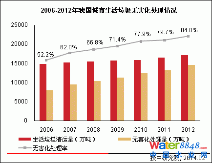 城市生活垃圾的快速增長(zhǎng)使“垃圾圍城”問題日益嚴(yán)峻,并且造成了嚴(yán)重的環(huán)境污染。因此,在巨大的垃圾壓力下,垃圾處理行業(yè)受到了廣泛重視并快速成長(zhǎng)起來。2012年,我國(guó)共有城市生活垃圾處理廠701座,無害化處理總量為14489.5萬噸,日處理能力達(dá)到44.6萬噸。同時(shí),城市生活垃圾無害化處理率也穩(wěn)中有升,從2006年的52.2%上升到2012年84.8%(見圖10)。