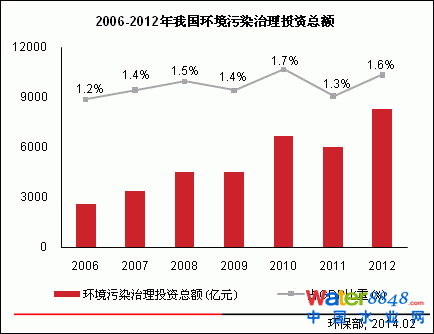 環(huán)保政策的密集出臺(tái)進(jìn)一步推動(dòng)了我國(guó)環(huán)境污染治理投資總額的攀升,2006-2010年,我國(guó)環(huán)境污染治理投資總額呈逐年增加趨勢(shì),經(jīng)過2011年的小幅回落之后,2012年大幅增長(zhǎng)。2012年,全國(guó)環(huán)境污染治理投資為8253.6億元,占當(dāng)年國(guó)內(nèi)生產(chǎn)總值(GDP)的1.6%(見圖4)。
