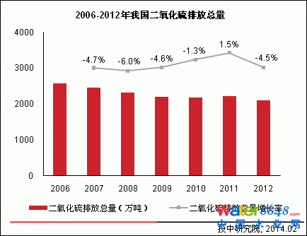 二氧化硫是主要大氣污染物之一,作為二氧化硫排放大戶的火電市場(chǎng)是大氣污染治理的重點(diǎn)。過去十年,受國(guó)家政策扶持及減排力度加強(qiáng)等因素影響,脫硫行業(yè)發(fā)展迅猛,先后經(jīng)過供不應(yīng)求的爆發(fā)性增長(zhǎng)、供大于求的階段性洗牌后逐漸回歸理性,進(jìn)入供需平衡的成熟階段。2006-2012年間,我國(guó)脫硫行業(yè)發(fā)展成效顯著,全國(guó)廢氣中二氧化硫排放量總體呈現(xiàn)下降趨勢(shì)。2012年,全國(guó)二氧化硫排放量2117.6萬噸,比上年減少4.5%(見圖8)。