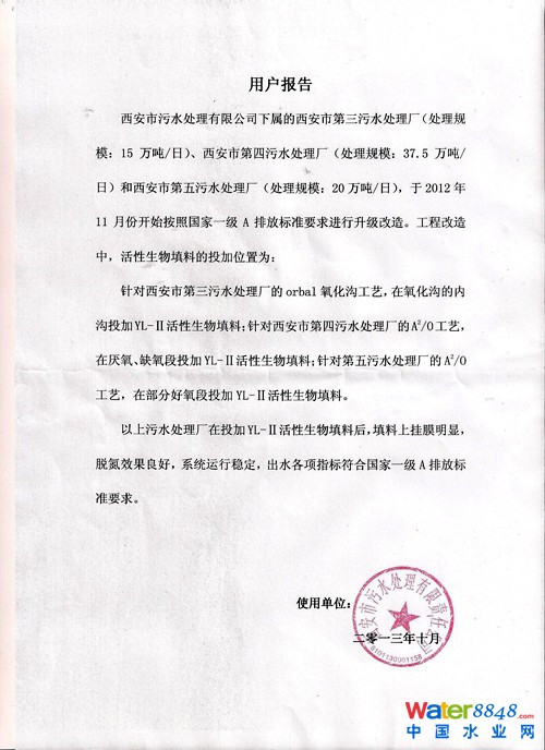 西安市污水處理有限責(zé)任公司下屬第三、第四、第五,三個污水廠于2013年進行升級改造,投加使用江蘇裕隆環(huán)保有限公司生產(chǎn)的YL -Ⅱ“活性生物填料”來提高生化處理效果,現(xiàn)三個污水廠出水指標(biāo)均符合國家一級A標(biāo),裕隆公司“活性生物填料”在氧化溝工藝、A2O工藝中的應(yīng)用得到了用戶的認可與肯定。