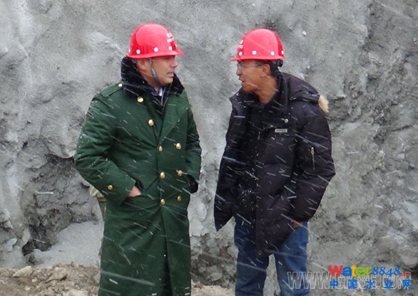 1、十八局集團(tuán)三公司總經(jīng)理?xiàng)罾ㄗ螅┖晚?xiàng)目經(jīng)理李士棟研究施工方案(伍振付興金 攝)