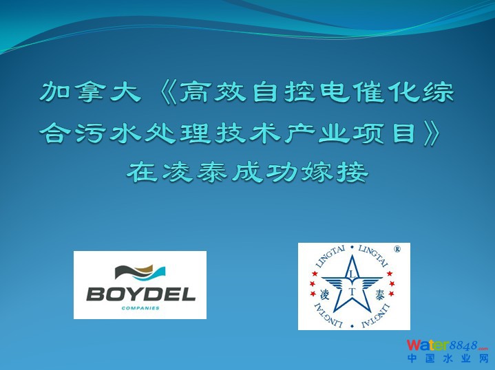 一種高效、自控、電催化綜合污水處理系統(tǒng)產(chǎn)業(yè)化項(xiàng)目在凌泰環(huán)保嫁接成功,世界領(lǐng)先的加拿大BOYDEL技術(shù)公司在中國(guó)獨(dú)家轉(zhuǎn)讓。