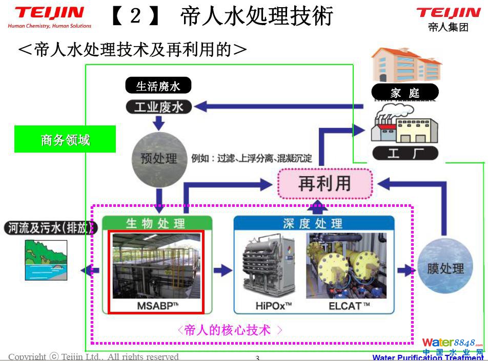 帝人(沈陽)環(huán)?萍加邢薰緦⒃谥袊鴩鴥(nèi)給客戶提供水處理相關(guān)的咨詢業(yè)務(wù)和綜合性解決方案,這些解決方案將采用先進(jìn)的具有減少污泥、縮短工期、節(jié)約管線工程費(fèi)用、運(yùn)行管理極其簡單等諸多特點(diǎn)的多段式生物處理裝置-“MSABP”(*)等水處理裝置。