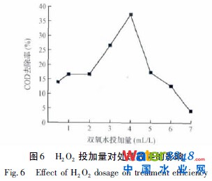 由圖6 可知,隨著H2O2用量的增加,COD 去除率先上升后下降。當H2O2投加量小于4 mL /L 時,COD 去除率隨H2O2用量的增加由13. 9% 升高到37. 27%,當H2O2用量繼續(xù)增加,COD 去除率逐漸降低,當H2O2投加量為7 mL /L 時,去除率僅為3. 99%。原因主要是微電解出水中含有較多的Fe2 + ,添加的H2O2與Fe2 + 反應,產(chǎn)生氧化性極強的·OH,·OH 能氧化分解難降解有機污染物。隨著H2O2濃度的增加,·OH 量增加,有利于降解有機物,但是H2O2濃度過高時,過量的H2O2不但不能通過分解產(chǎn)生更多的羥基自由基,反而在反應一開始就把Fe2 + 迅速氧化成Fe3 + ,使反應在Fe3 + 催化下進行,如此既消耗H2O2,又抑制·OH 的產(chǎn)生。因此,實驗確定H2O2最佳投加量為4 mL /L 左右。