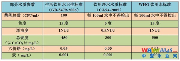 生活飲用水國標(biāo)、飲用凈水國標(biāo)以及WHO飲用水標(biāo)準(zhǔn)部分參數(shù)的對比,水質(zhì)檢測的指標(biāo)有百來項(xiàng),以上擇取了標(biāo)準(zhǔn)中存在差異的部分指標(biāo)。