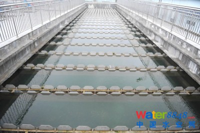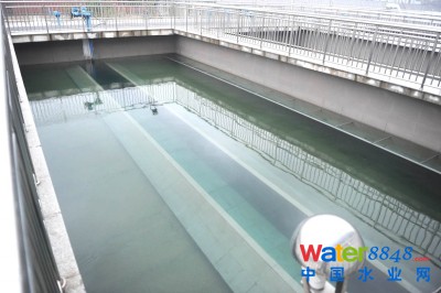 記者看到,在深8米的池中,一根根粘滿絨毛似的生物填料,豎立在池中,數(shù)量達(dá)到上百根。據(jù)介紹,整個(gè)生物接觸池分為兩組,一組分成四格,處理過后,進(jìn)入常規(guī)工藝的沉淀池。“水進(jìn)入沉淀池后,主要是讓水變清,濾去水中沉淀物,類似于過去在水中加礬的作用。”