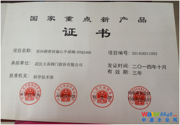 大禹研發(fā)的雙向硬密封偏心半球閥系列產(chǎn)品,通過了專家評審、各區(qū)級市級省級層層評選推薦,最終通過了國家科學(xué)技術(shù)部的鑒定和認(rèn)可,并頒發(fā)了“國家重點(diǎn)新產(chǎn)品”榮譽(yù)證書,大禹的研發(fā)團(tuán)隊必將再接再厲,再創(chuàng)輝煌!