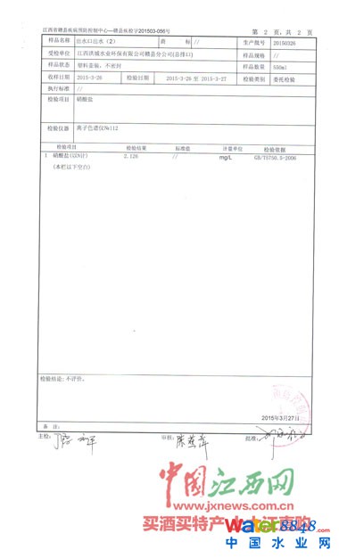 記者在贛縣疾控中心出具的兩份檢驗報告單上看到,兩份樣品水中硝酸鹽值分別為1.301 mg/l和2.126mg/l,而根據(jù)相關(guān)標(biāo)準(zhǔn),生活飲用水衛(wèi)生標(biāo)準(zhǔn)值(地下水源限值)為20mg/l。
