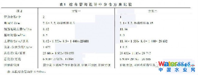 本開(kāi)發(fā)區(qū)綜合管溝橫斷面采用矩形斷面形式,由于本工程管道倉(cāng)中布置的管道較多,有給水管、中水管、供熱管、垃圾真空管、弱電線纜,如把它們都布置在1個(gè)管道倉(cāng)中或者分成2個(gè)倉(cāng)布置,綜合管溝鋼筋混凝土墻壁和底板厚度相差較大,從而導(dǎo)致綜合管溝投資(特別是土建投資)也相差較大,為了選擇經(jīng)濟(jì)合理方案,設(shè)計(jì)中對(duì)其中一段綜合管溝管道倉(cāng)分別按2個(gè)倉(cāng)和1個(gè)倉(cāng)進(jìn)行布置,見(jiàn)圖1和圖2,對(duì)其進(jìn)行了技術(shù)經(jīng)濟(jì)比較,見(jiàn)表1。通過(guò)上述比較可知,方案一投資省且管理也較方便,經(jīng)過(guò)綜合分析選擇方案一作為一條主干道綜合管溝實(shí)施方案。再加上電力倉(cāng),綜合管溝最終采用3個(gè)倉(cāng)方案。