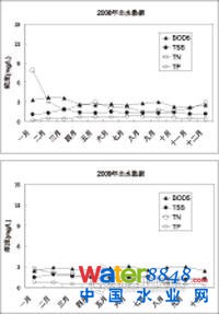 位于美國(guó)北卡羅來(lái)納州Smithfield的污水處理廠面對(duì)水質(zhì)水量的變化,采取了好氧、缺氧等生物處理措施,但仍不能實(shí)現(xiàn)達(dá)標(biāo)排放,出水硝態(tài)氮濃度停留在6~8mg/L。2003年,該廠安裝了elimi-NITE反硝化濾池,其對(duì)出水總氮達(dá)標(biāo)起了關(guān)鍵作用。安裝后,出水總氮濃度降至1.96mg/L,硝態(tài)氮和BOD等去除情況如表2及圖2所示。