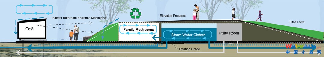 突起的地形起到地面公共設(shè)施核心的作用,可以把對(duì)根部系統(tǒng)的破壞降到最低,同時(shí)設(shè)有雨水蓄水池、盥洗室和雜