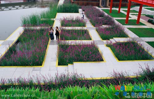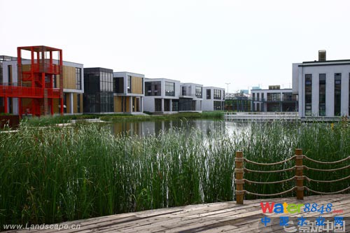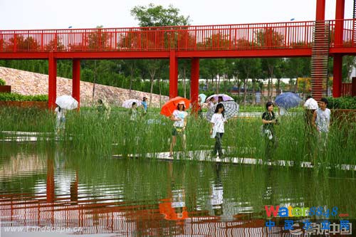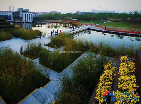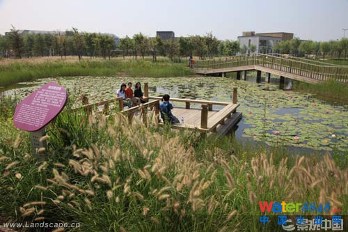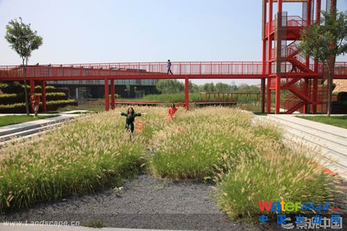 (3)濕地-湖泊帶:包括帶狀湖泊和兩側(cè)的濕地。外圍為臨湖親水帶,由順地勢(shì)跌落的棧橋構(gòu)成,豐富的水際植物掩映著穿越其中的棧橋,使人與水和生物近距離接觸;在內(nèi)側(cè)(湖的西、北側(cè))為大片的濕地,恢復(fù)和再現(xiàn)天津地域性景觀,由蘆葦和其他濕地植物構(gòu)成。一條蜿蜒的步道棧橋穿越其中,并穿連多個(gè)木平臺(tái)和蔭棚。兩個(gè)濱水濕地都是濕地植物的科普走廊,也即取樣天津濕地植物。