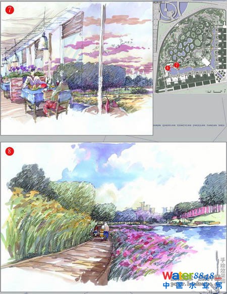 (8)一組服務(wù)設(shè)施:在公園的西南角,是一組服務(wù)性建筑,它們以水為明堂,半圍合布局,互相之間以廊道、棧橋相聯(lián)系。建筑兩層為主,輕盈而親切,飄浮于水面和濕地之上,主要提供餐飲、茶吧、酒吧、書(shū)吧等服務(wù)。