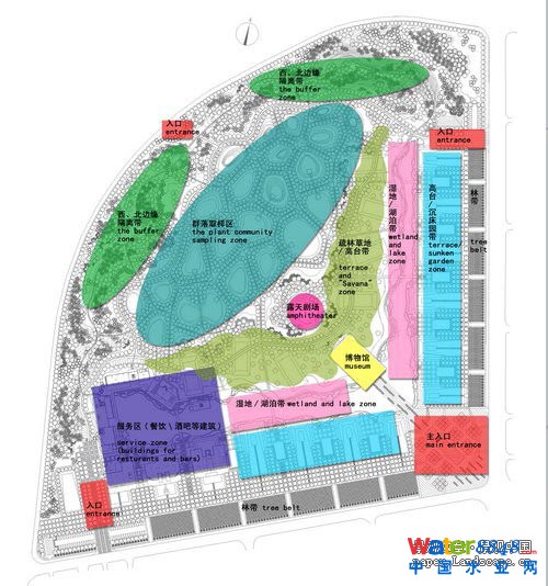 (5)群落取樣區(qū):從空間位置和面積上來(lái)說(shuō),這是公園的核心區(qū)域。由林網(wǎng)圍合成一個(gè)個(gè)泡狀空間(可稱(chēng)為樣泡),每個(gè)空間都有不同的標(biāo)高,海拔高差變化以10cm為單位,因而會(huì)有不同的水分和土壤的物理和化學(xué)特性,適宜于不同植物群落的生長(zhǎng)。初始的群落在天津地域內(nèi)挖取同樣海拔和水分條件的地塊,連同土壤和植被,完整移植到公園的樣泡內(nèi)。取樣過(guò)程本身要求有環(huán)保意識(shí),即采用小斑塊或窄條帶的取樣,以保證不破壞原生境的自我恢復(fù)能力。每個(gè)樣泡內(nèi)都有一個(gè)平臺(tái),伸入群落內(nèi)部,使人有貼近群落觀賞的機(jī)會(huì)。林網(wǎng)由當(dāng)?shù)刈顬閺?qiáng)勢(shì)的柳樹(shù)作為基調(diào)樹(shù)種,在交叉部位種以其他鄉(xiāng)土樹(shù)種。林網(wǎng)內(nèi)是自然的游步道,粗沙鋪地。