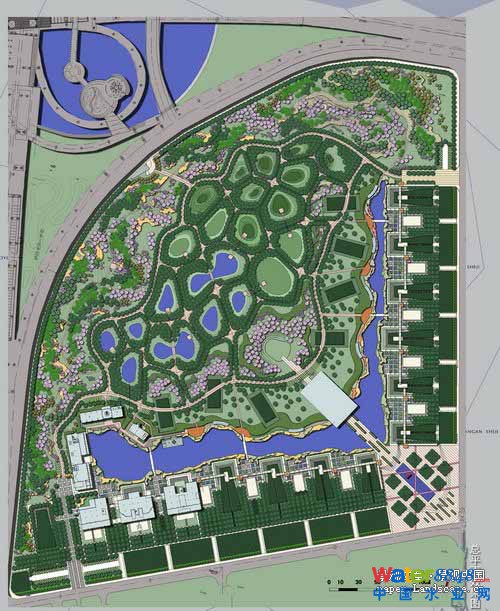 (6)西、北邊緣隔離帶:公園西-北側(cè)瀕臨立交橋,噪音和視覺(jué)干擾都比較大,而且遠(yuǎn)離社區(qū)居民,故結(jié)合地形設(shè)計(jì)綠化隔離帶,并于原有的靶場(chǎng)地形相結(jié)合,為公園做了一個(gè)弧狀綠屏。