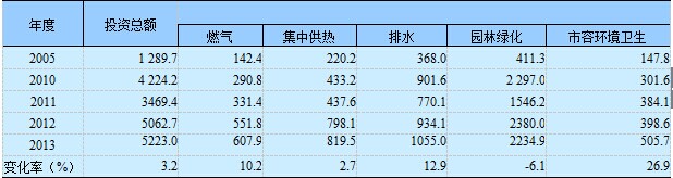 2013年,城市環(huán)境基礎設施建設投資中,燃氣工程建設投資607.9億元,比上年增加10.2%;集中供熱工程建設投資819.5億元,比上年增加2.7%;排水工程建設投資1055.0億元,比上年增加12.9%;園林綠化工程建設投資2234.9億元,比上年減少6.1%;市容環(huán)境衛(wèi)生工程建設投資505.7億元,比上年增加26.9%。