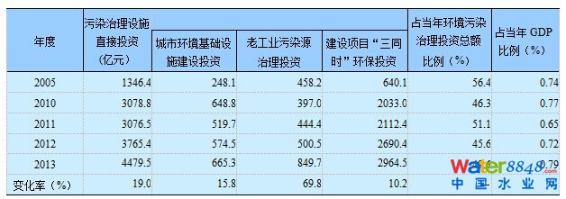 2013年,我國污染治理設施直接投資總額為4479.5億元,占污染治理投資總額的48.6%,其中城市環(huán)境基礎設施投資、老工業(yè)污染源治理投資和建設項目“三同時”環(huán)保投資分別占污染治理設施直接投資的14.8%、19.0%和66.2%。建設項目“三同時”環(huán)保投資是污染治理設施直接投資的主要來源。