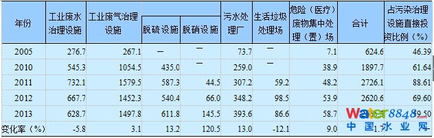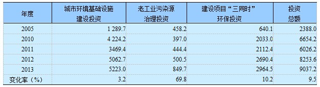 2013年,環(huán)境治理設施直接投資比上年增加19.0%。其中,城市環(huán)境基礎設施投資、老工業(yè)污染源治理投資和建設項目“三同時”環(huán)保投資分別比上年增加15.8%、69.8%和10.2%。