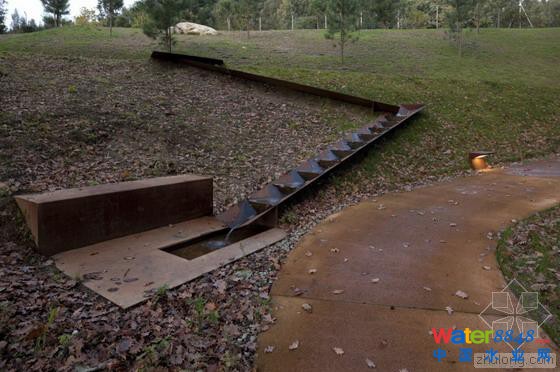 這是一個“景觀化”的地表水收集系統(tǒng),猶如一座現(xiàn)代雕塑趴在草坡上。最下端的地表水收集點,結(jié)合一個微型休閑平臺進(jìn)行了整體設(shè)計。地表水沿著園路兩側(cè)順勢而下,匯集到此處的小水面上,再集中匯往下面的一個景觀水池中。幾塊耐候鋼板拼接成休憩平臺,“漂浮”在小水面上,有點意思。