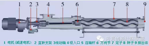 在污泥泵送系統(tǒng)中通常采用偏心螺桿泵,其主要工作部件是偏心螺桿(轉子)和螺桿村套(定子)。當電動機帶動泵軸轉動時,螺桿一方面繞自身的軸線旋轉,另一方面又沿襯套內表面滾動,于是形成泵的密封腔,螺桿每旋轉1周,密封腔內的污泥就向前推進1個螺距,隨著螺、桿的連續(xù)轉動,被輸送的污泥以螺旋形式從一個密封腔壓向另一個密封腔,最后擠出泵體。泵的易損件定子和轉子通常每2個月到半年更換一次。