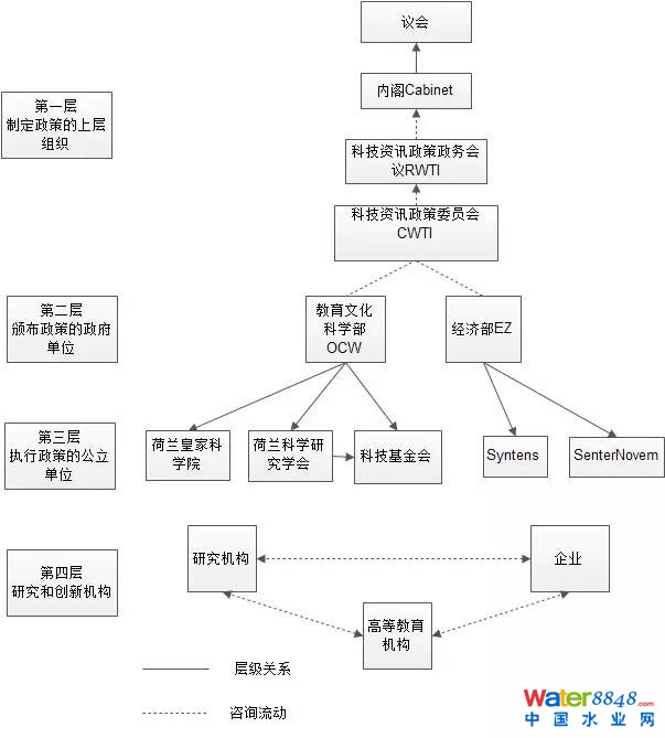 20世紀(jì)70年代,迎來了厭氧生物技術(shù)發(fā)展的第二個高潮。隨著經(jīng)濟(jì)的快速發(fā)展,世界能源危機(jī)和環(huán)境污染問題越來越突出?茖W(xué)家們開發(fā)了以UASB反應(yīng)器(荷蘭)為代表的第二代厭氧反應(yīng)器,該反應(yīng)器可將污泥停留時間與水力停留時間分離,處理高濃度廢水的停留時間從過去的二三十天可縮短到幾小時或幾天,使得厭氧生物處理技術(shù)開始迅速發(fā)展和廣泛應(yīng)用。從世界范圍來看,南非在20世紀(jì)50-60年代就采用了厭氧技術(shù)處理高濃度工業(yè)廢水,以及20世紀(jì)60年代美國的McCarty小組就厭氧濾池的研究均在厭氧技術(shù)發(fā)展中實現(xiàn)了突破性的研究,但并沒有得到政府和業(yè)界的支持和認(rèn)可。而在荷蘭,厭氧生物技術(shù)先后在處理農(nóng)產(chǎn)品工業(yè)廢水、林產(chǎn)品制造業(yè)和造紙工業(yè)廢水處理、高含鹽廢水、化工和石化工業(yè)廢水等方面取得了成功。荷蘭瓦格寧根(Wageningen)農(nóng)業(yè)大學(xué)的lettinga教授的科研成果在厭氧技術(shù)發(fā)展史上具有劃時代的意義。1970年,lettinga教授等人首次進(jìn)行了厭氧研究,70年代初,進(jìn)行了制糖和土豆淀粉廢水的小試和中試。1976年,他們在荷蘭Halfweg的CSM工廠建造了200m3的示范上流式厭氧污泥床反應(yīng)器(Up-flow Anaerobic Sludge Bed,簡稱UASB),次年1000m3規(guī)模的UASB反應(yīng)器投入運行。1985年,荷蘭帕克(Paques)公司發(fā)明了厭氧內(nèi)循環(huán)反應(yīng)器(Internal Circulation Reactor,簡稱IC),與百歐仕(Biothane)以及其他咨詢公司成功開拓了厭氧技術(shù)的國際市場。1986年,lettinga等人發(fā)明了第三代高效厭氧反應(yīng)器——膨脹顆粒污泥床(Expanded Granular Sludge Bed,簡稱EGSB)反應(yīng)器。在20世紀(jì)80年代和90年代,UASB反應(yīng)器已經(jīng)成為厭氧工藝的主流,到1999年國內(nèi)外所建立的厭氧工藝中UASB反應(yīng)器約占全部項目的59%。從90年代開始,EGSB反應(yīng)器得到應(yīng)用,目前EGSB反應(yīng)器占新建項目的50%。lettinga教授認(rèn)為厭氧生物技術(shù)在荷蘭獲得成功的原因主要有:市場需求以及與工業(yè)界的良好合作、荷蘭政府的科研及創(chuàng)新體系以及相關(guān)政策、跨領(lǐng)域科學(xué)家的良好合作。荷蘭政府的具體措施是值得我們深入研究的。荷蘭的科研和創(chuàng)新系統(tǒng)主要分為四個層面,如下圖1: