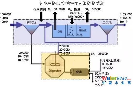 該種方法以傳統(tǒng)概念“消除污染物”為主導(dǎo),具有效率低(污泥濃度、SRT、負(fù)荷等),能耗高(每人年降解COD和N需電耗約20-25kWh),溫室氣體排放(CO2、N2O)多,污染物資源化利用水平低(C、N、P等)的缺點(diǎn)。