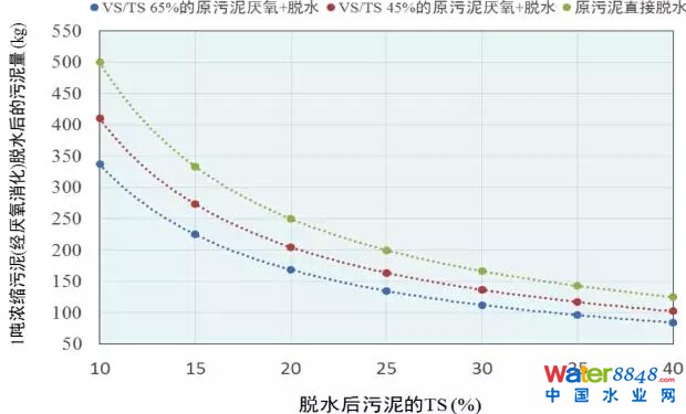 1噸TS為5%的濃縮污泥經(jīng)厭氧消化脫水或直接脫水后的污泥量