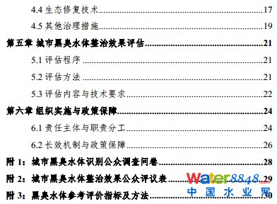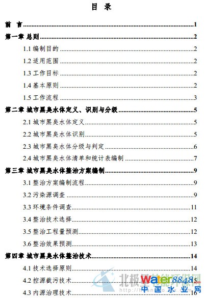 本指南的主要內(nèi)包括:總則、城市黑臭水體定義、識(shí)別與分級(jí)、城市黑臭水體整治方案編制、城市黑臭水體整治技術(shù)、城市黑臭水體整治效果評(píng)估、組織實(shí)施與政策保障。
