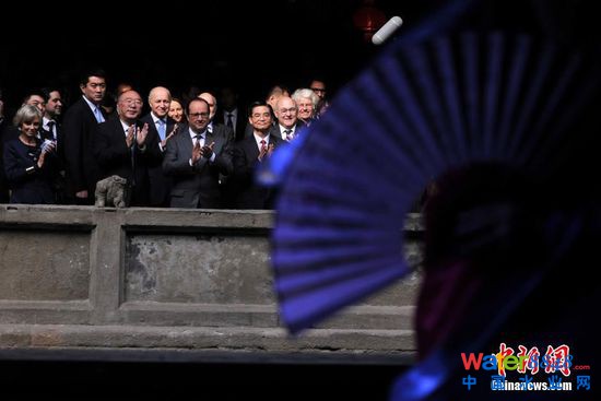 11月2日,法國總統(tǒng)弗朗索瓦·奧朗德專機抵達重慶開啟他對中國的第二次國事訪問。此次亦是奧朗德首次正式訪問重慶,并有官方代表團、文化界人士、企業(yè)家隨行。奧朗德在重慶市長黃奇帆的陪同下,先后參觀了重慶中法唐家沱污水處理廠和湖廣會館,了解重慶經(jīng)濟社會和文化發(fā)展情況。圖為重慶市長黃奇帆陪同法國總統(tǒng)奧朗德觀看川劇變臉。 中新社記者 陳超 攝