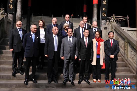 11月2日,法國總統(tǒng)弗朗索瓦·奧朗德專機抵達重慶開啟他對中國的第二次國事訪問。此次亦是奧朗德首次正式訪問重慶,并有官方代表團、文化界人士、企業(yè)家隨行。奧朗德在重慶市長黃奇帆的陪同下,先后參觀了重慶中法唐家沱污水處理廠和湖廣會館,了解重慶經(jīng)濟社會和文化發(fā)展情況。圖為中方代表與法國代表團部分成員在湖廣會館內(nèi)合影留念。 中新社記者 陳超 攝