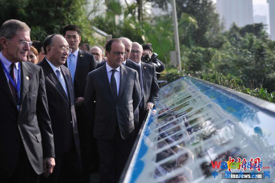 11月2日,法國總統(tǒng)弗朗索瓦·奧朗德專機抵達重慶開啟他對中國的第二次國事訪問。此次亦是奧朗德首次正式訪問重慶,并有官方代表團、文化界人士、企業(yè)家隨行。奧朗德在重慶市長黃奇帆的陪同下,先后參觀了重慶中法唐家沱污水處理廠和湖廣會館,了解重慶經(jīng)濟社會和文化發(fā)展情況。圖為重慶市長黃奇帆陪同奧朗德參觀重慶中法唐家沱污水處理廠。 中新社記者 陳超 攝