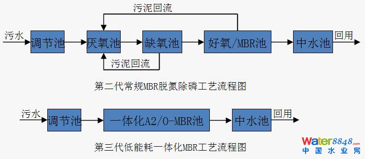 一種新型低能耗一體化A2/O-MBR反應(yīng)器(專利號:201510092932.8與變量曝氣技術(shù)(201410385247X)兩項專利結(jié)合,可將曝氣量降至第二代常規(guī)MBR的25-30%左右,與傳統(tǒng)活性污泥法的曝氣能耗相當(dāng);