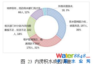 地塊內(nèi)(小區(qū)、單位等)積水問題最主要原因的調(diào)查中,36%的人選擇了排水管網(wǎng)能力低,亟需改造31%的受訪者選擇了維護(hù)管理落后,疏通清淤不及時(shí)、選擇相關(guān)部門對小區(qū)內(nèi)澇問題重視不足,投資不足、地勢較低,周邊雨水都匯流過來外圍河道漲水的受訪者占比分別為18%12%3%。